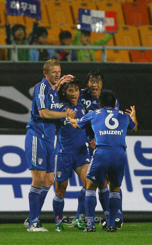 전반 선취골을 넣은 수원 배기종이 동료들과 환호하고 있다.