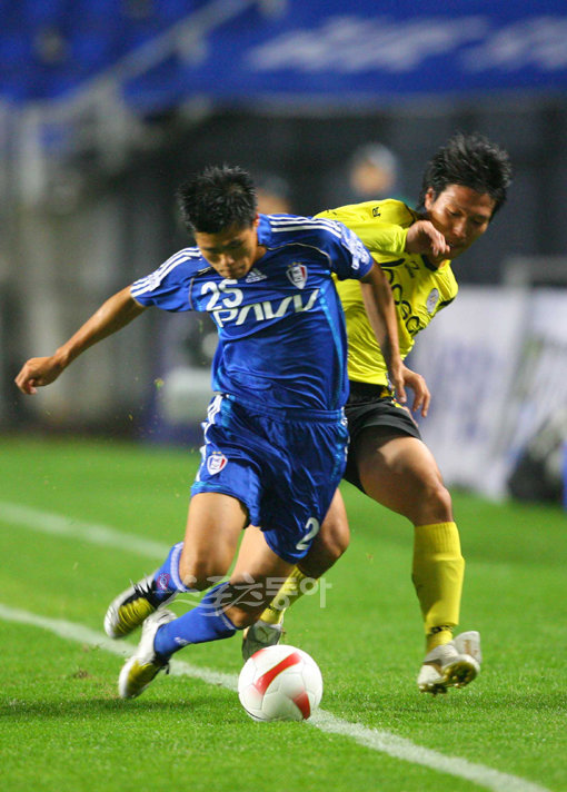 수원 최성환이 공을 뺏기지 않게 안간힘을 쓰고 있다.