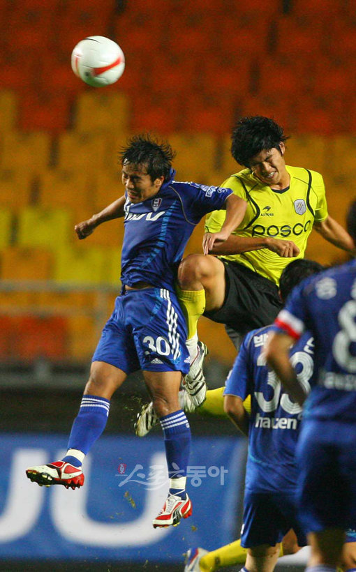 수원 최성현이 공중볼 경합을 벌이고 있다.