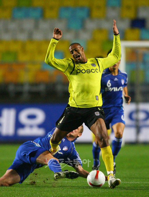 전남 슈바가 드리블 도중 수원 마토에 태클에 걸려 넘어지고 있다.