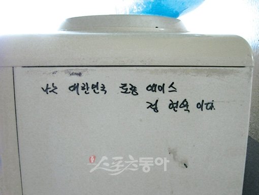 그런데 이 문구는 삼성 라커룸 벽을 비롯해 대구구장 곳곳에 마치 낙서처럼 쓰여 있다. 삼성의 코치들은 “온 사방에 도배를 해놨다”며 고개를 절레절레 흔들고 있다. 그런데 정작 정현욱은 “절대 내가 쓴 게 아니다”며 손사래를 친다.