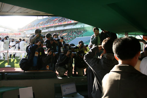 전국을 휘감은 야구 열기 때문에 포스트시즌 취재 경쟁이 무척 뜨겁다. 경기 전 양 팀 덕아웃에 몰린 취재진을 보고 ‘기자 반, 선수 반’이라는 농담이 나올 정도. 특히 SK 김성근 감독과 두산 김경문 감독이 덕아웃에 등장할 때면 수많은 취재기자들과 사진기자들이 북새통을 이룬다. 한국시리즈 2차전을 앞둔 27일 문학구장에서도 마찬가지. 김경문 감독이 나타나 대화를 시작하자 사진기자들이 동시에 등장해 카메라 세례를 퍼부었다. 처음엔 어색해하던 김 감독도 이제는 표정과 태도가 한결 부드러워졌다. 확실히 지금 대한민국은, 야구가 대세다.