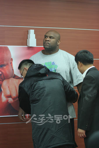 ‘야수’ 밥샵(34.미국)이 제3회 포레버히어로(Forever Hero) 메인 이벤트에서 대결을 벌일 한국 프로레슬링의 자존심 이왕표에게 뺨을 맞은 뒤 흥분을 감추지 못하고 있다.