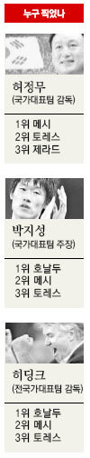 허정무 감독은 1위로 메시를 선택했고 이어 2위 토레스, 3위는 잉글랜드 대표팀 미드필더 제라드에 투표했다. 반면 박지성(맨체스터 유나이티드)은 팀 동료 크리스티아누 호날두에게 1위표를 던졌으며 2위 메시, 3위 토레스를 선택했다.