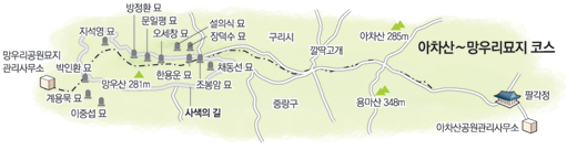 망우리공원묘지 순환코스(사색의 길) 한바퀴는 5.2km. 아차산(285m)-용마산(348m)-망우산(281m)으로 이어지는 코스는 지도상으로도 10km가 넘는다. 야트막한 데다 오르막내리막이 적절하게 자리 잡고 있어 왕복 150분 크로스컨트리 코스로는 안성맞춤이다. 달림이들은 평소엔 집 가까이에서 연습하다가, 일주일에 한두 번씩 이곳을 찾아 ‘안 쓰던 근육’을 키운다.