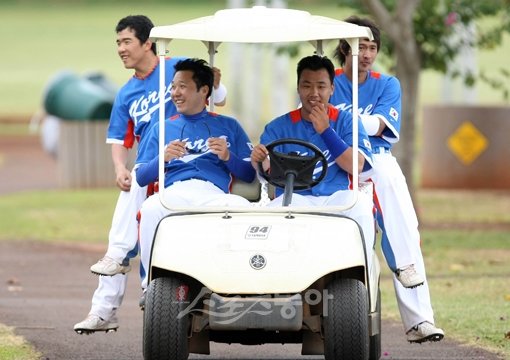 WBC 대표팀 전지훈련이 한창인 하와이 센트럴 오아후 리저널 파크는 규모가 꽤 크다. 구장과 구장 사이를 오가며 훈련해야 하는 선수들이 “왔다갔다하는 것만으로도 운동이 된다”고 할 정도. 화장실도 걸어서 5분은 가야 한다. 그래서 WBC 내야의 핵심인 정근우, 박기혁, 이범호, 박진만(사진 왼쪽 위부터 시계방향)이 머리를 썼다. 직원용 카트를 타고 단체로 화장실에 다녀오는 것이다. 재치 넘치는 이들의 모습에 주변이 웃음바다가 된 것은 물론이다.