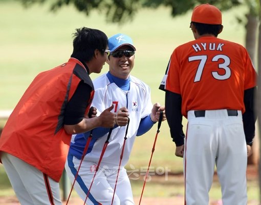 ○강흠덕 트레이너의 말=박진만 선수 어깨의 증상은 정확히 극상근 부분파열에 AC조인트 염증과 관절낭 염증을 더한 거예요. 선수들 대부분이 조금씩 이런 문제를 갖고 있는데, 큰 부상은 아니지만 약한 부상도 아니지요. 일단 오전에는 근력을 강화시키는 팔 운동을 반복하고, 숙소에 들어가면 아이싱을 하면서 쉬다가 저녁식사 후 감각을 촉진시키는 운동을 합니다. 옆에서 트레이너들이 팔을 잡고 사선으로 움직여주면서 관절 가동범위를 넓히는 겁니다. 사실 박진만 선수는 베이징올림픽 때도 어깨가 아파서 3주 동안 관리를 해줬는데 그때보다 지금이 더 심해요. 통증 때문에 인터벌 스로잉 프로그램(ITP)도 못하고 있을 정도니까. 그래도 손혁 인스트럭터, 조대현 트레이너와 함께 열심히 해서 그런지 본인은 많이 나아지고 있다고 하네요.