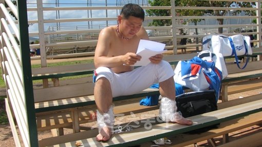 내리쬐는 태양 아래서 훈련을 마친 박경완. 양 발목에 아이싱을 한 채 열심히 무언가를 들여다보고 있다. 상대국 선수들에 대한 자료? 아니다. 손혁 한화 인스트럭터가 쓰고 있는 책의 원고 일부다. 국내 최고의 베테랑 포수인 박경완에게 손 인스트럭터가 즉석 감수를 부탁한 것이다. 한장 한장 훑어보던 박경완은 “투수들이 읽으면 좋은 내용이 많은 것 같네요. 나중에 애들한테 보라고 해야겠어요”라며 고개를 끄덕이기도. 어쨌든 감독과 선후배들의 신임을 한 몸에 받는 안방마님이다.