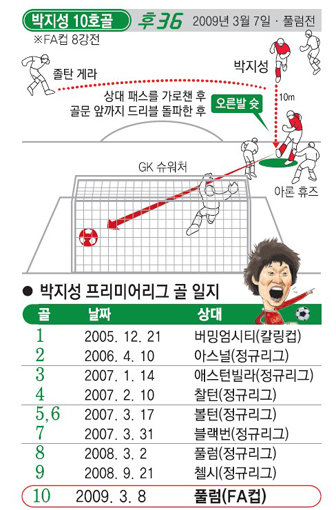 박지성은 8일 새벽(한국시간) 크레이븐 코티지 스타디움에서 벌어진 2008-2009 FA컵 8강 풀럼과의 원정에서 후반 36분 페널티 지역 왼쪽에서 강력한 오른발 슛으로 팀의 4번째 골을 작렬시켰다. 맨유의 4-0 승. FA컵에서 첫 골을 기록한 가운데 지난 해 9월 21일 첼시전 이후 5개월18일만에 터진 시즌 2호 골이자, 2005년 프리미어리그 진출 이후 통산 10번째 골이다.