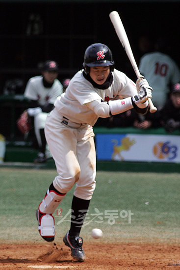 경동고의 타자 백영훈이 몸쪽으로 오는 공에 놀라 황급히 피하고 있다.