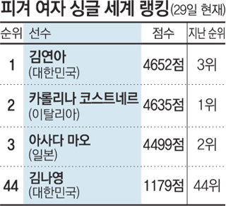 반면에 김연아의 라이벌인 아사다 마오(일본·188.09점)는 4위에 그쳐 시니어 데뷔 이후 처음으로 메달 없이 귀국길에 오르게 됐다. 캐나다의 조아니 로셰트(191.29점)와 일본의 안도 미키(190.38점)가 각각 2, 3위를 차지했다. 김나영(인하대)은 17위로 지난해 대회(19위)보다 두 계단 올라섰다.