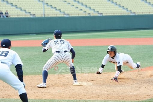 경남고 서진용이 1루에서 투수의 견제때 재빨리 슬라이딩을 하고 있다.