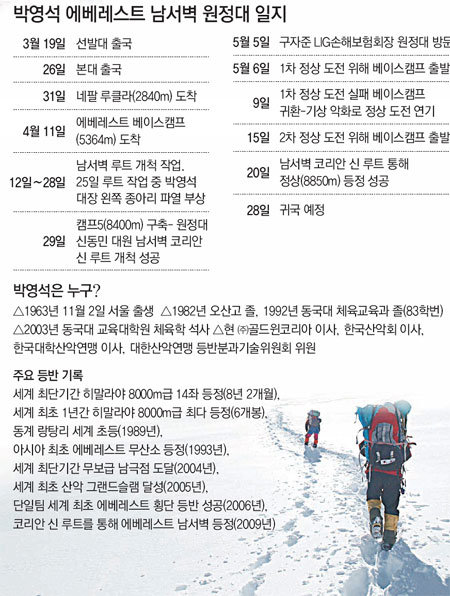 2005년 산악 그랜드슬램(히말라야 14좌 및 7대륙 최고봉 완등, 3극점 도달)을 달성한 그는 의기앙양하게 다시 남서벽 앞에 섰다. 그랜드슬램 달성 때문에 미뤄뒀던 ‘숙제’를 마치겠다는 생각도 있었다. 그러나 박 대장은 2007년에도, 지난해에도 남서벽을 오르는 데 실패했다. 실패보다는 성공에 익숙하던 그가 남서벽에서 네 번 연속 무릎을 꿇은 것이다.