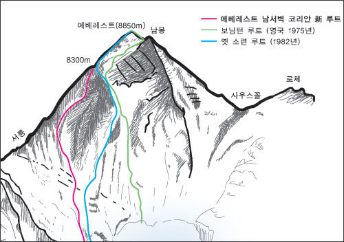 거센 바람이 짐승의 울음소리를 내며 텐트를 세차게 때렸다. 밖은 불빛 한 점 없는 캄캄한 어둠. 손목시계는 20일 0시 40분(한국 시간 오전 3시 55분)을 가리켰다. 해발 8400m의 에베레스트 서릉 위. 죽음과 같은 적막감이 몸을 무겁게 짓누른다.