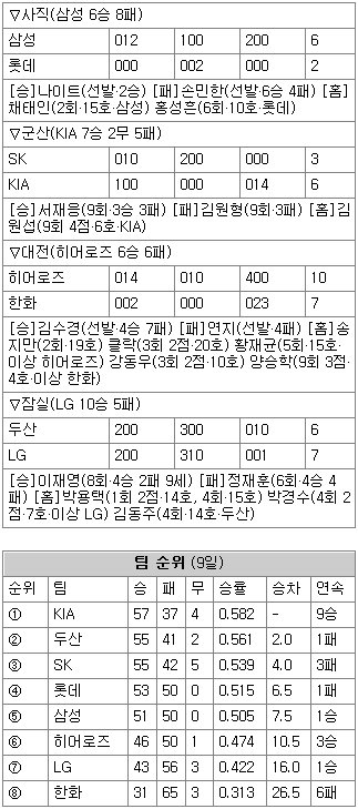 5위 삼성은 4위 롯데를 6-2로 이기고 승차를 1경기로 좁혔다. 삼성 선발 투수 브랜든 나이트는 2경기 연속 승리를 챙기며 한국 무대에 적응했다. 히어로즈는 한화를 10-7로 눌렀다.