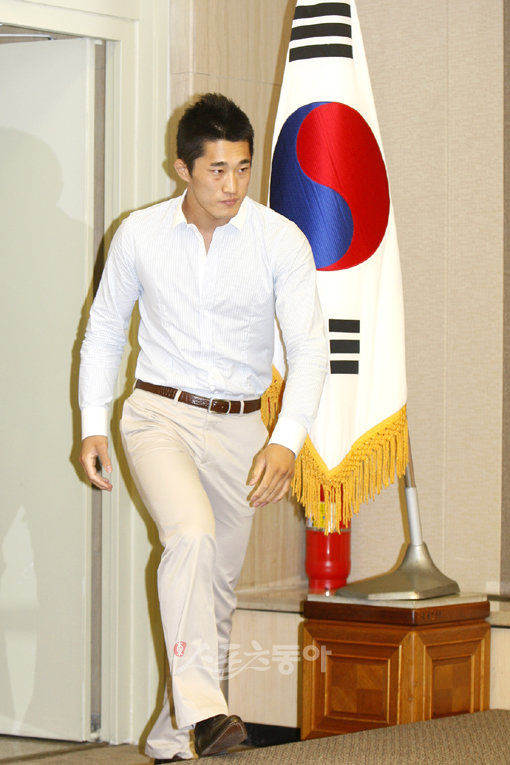 UFC 파이터 김동현(왼쪽)이 14일 오전 서울 중구 태평로 한국프레스센터에서 열린 승리 기념 기자회견에서 취재진으로부터 여자친구에 관한 질문을 받자 쑥쓰러워하며 미소짓고 있다. 양회성 기자 yohan@donga.com