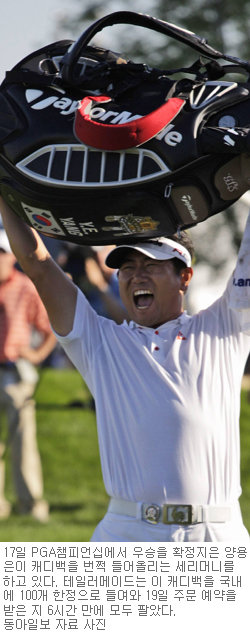 ‘바람의 아들’ 양용은(37·테일러메이드)은 17일 PGA챔피언십에서 우승한 뒤 승리의 기쁨에 자신의 캐디백을 번쩍 들어올렸다. 이런 이색 세리머니는 언론 매체를 통해 전 세계에 퍼지며 강렬한 인상을 남겼다. 양용은은 “날아갈 것 같은 기분이었다. 옆에 가방이 있기에 즉흥적으로 번쩍 들었다”며 웃었다. 미리 준비된 행동은 아니었지만 그 파장은 엄청났다. 이 캐디백은 양용은의 메인 스폰서인 테일러메이드에서 주요 투어 프로들에게 PGA챔피언십 출전을 기념해 특별 제작해 준 제품이었다. 마침 국내에도 100개를 들여와 한정 판매에 들어갔는데 19일 주문 예약을 받은 지 6시간도 안 돼 모두 팔려나갔다. 김희재 테일러메이드코리아 홍보팀장은 “메이저 대회 때마다 기념 가방을 출시하는데 이런 반응은 처음이다. 양용은 프로가 사용한 하이브리드 클럽은 재고가 바닥났다”고 밝혔다. 양용은의 의상 스폰서인 르꼬끄 골프의 관계자들도 표정 관리하느라 바쁘다. 양용은이 닭 모양 심벌을 지닌 르꼬끄 골프의 흰색 바지와 티셔츠 차림으로 메이저 우승컵을 안은 뒤 “백의민족을 상징했다”는 소감까지 밝혀 이 업체도 덩달아 스포츠라이트를 받았다. 르꼬끄 골프 측은 양용은의 우승으로 2000억 원 이상의 홍보 효과를 본 것으로 분석했다. 아시아나, 3년간 국제선 1등석 제공 한편 아시아나항공은 양용은과 부인에게 3년 동안 국제선 1등석 항공권을 제공하고 세 아들에게도 비즈니스석을 3년 동안 무상으로 이용할 수 있도록 했다. 김종석 기자 kjs0123@donga.com