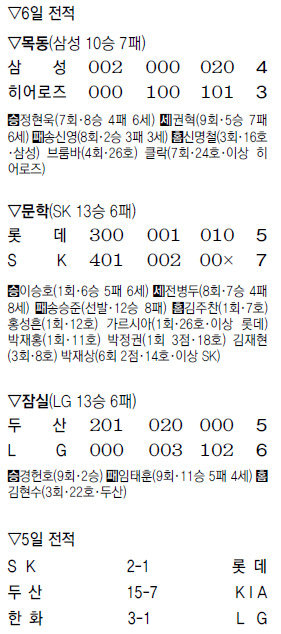 SK가 6일 롯데를 7-5로 꺾고 9연승을 달렸다. 지난해 6월 이후 9연승은 처음. 8월 2일 KIA가 선두로 치고 올라온 이후 6.5경기까지 벌어졌던 승차도 3경기로 좁혔다.