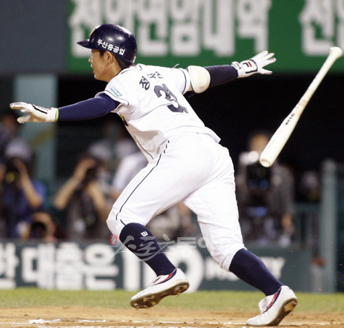 10일 서울 잠실야구장에서 열린 2009프로야구 두산 대 히어로즈의 경기.6회말 2사 2루서 두산 정수빈이 1타점 1루타를 치고 있다. 잠실 | 양회성 기자 yohan@donga.com