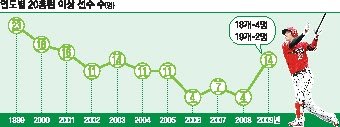 여기서 주목할 것은 ‘20홈런 이상’, 즉 ‘준 홈런왕’이라고 할 수 있는 선수들의 숫자다. 지난해 20홈런 이상을 기록한 선수는 고작 4명. <그래픽 참조> 그러나 올해는 벌써 14명이 20홈런 이상을 기록했다. 20홈런 이상 선수수가 두 자리를 기록한 것은 2006년 이후 처음.