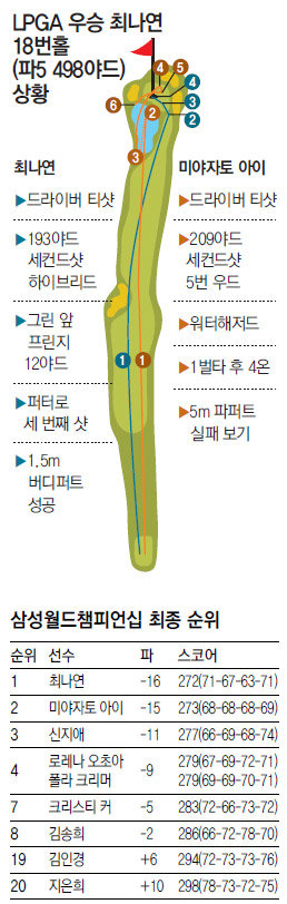 2타 차 단독 선두로 출발한 최나연은 2, 4번홀 버디에 이어 6번홀(파5)에서 이글을 낚아 7타 차까지 달아났다. 싱거운 승리가 예상됐지만 역시 장갑을 벗을 때까지 알 수 없는 게 골프였다. 9번홀부터 10, 11번홀까지 연이어 보기를 했다. 반면 최나연의 앞 조에 있던 미야자토는 슬금슬금 타수를 줄이더니 12번홀 버디로 1타 차까지 압박했다. 뒷덜미가 찌릿해진 최나연은 15번홀에서 어이없는 3퍼트로 공동 선두를 허용했고 16번홀(파3)에서 미야자토가 버디를 잡아 오히려 1타 차 2위로 밀려났다. 눈앞에 아른거리던 우승컵이 사라지는 듯했다.