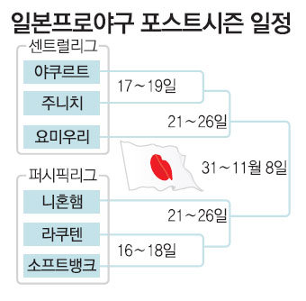 퍼시픽리그에서는 1위 니혼햄과 2위 라쿠텐, 3위 소프트뱅크가 가을잔치에 초대받았다. 라쿠텐과 소프트뱅크의 1스테이지는 16일부터 열린다. 양 리그 챔피언이 맞붙는 저팬시리즈(7전 4선승제)는 31일 막을 올린다.
