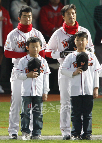 ▲ ‘비장한 국민의례.’ 정근우가 경기 전 모자를 벗어 가슴에 댔다. 유난히 올해 포스트시즌에서 헤매고 있는 캡틴 김재현과 비장한 표정으로 국기를 바라보고 있다. 오늘은 치고 말겠다는 비장함을 눈빛으로 발사. 발근우 뛴다 뛰어…“돌아!돌아!”