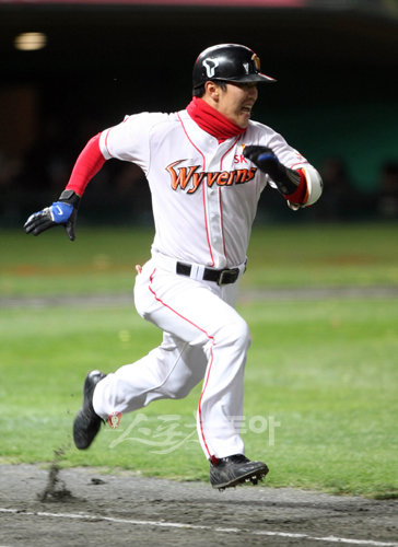 ▲ ‘날쌘돌이’ 정근우가 살아났다. 앞선 4타석에서는 무안타에 그쳤지만 8회 2루쪽 내야안타로 출루한 뒤 빠른 발을 살려 2루를 훔쳤다. 그리고 박재상의 중견수 플라이 때 재빠르게 3루로 파고들었다. ‘정근우의 발이 살아야 SK가 산다’는 말이 실감나는 순간이었다.