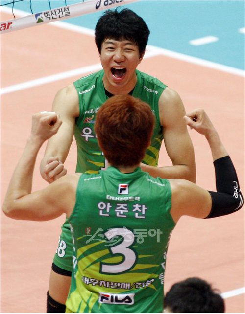 8일 오후 인천 도원체육관에서 열린 프로배구 NH농협 09-10 V리그 대한항공 대 우리캐피탈의 경기에서 우리캐피탈 신영석이 득점을 올린 뒤 동료 안준찬과 함께 기뻐하고 있다.