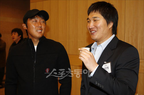 2일 오전 서울교육문화회관에서 열린 ‘제10차 한국프로야구선수협회 정기총회’에 참석한 삼성 배영수(왼쪽)와 LG 이진영이 행사 전 만나 대화하고 있다.