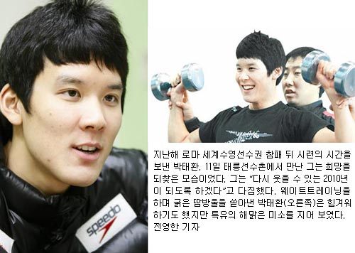 《11일 서울 태릉선수촌에서 만난 박태환(21·단국대)은 웨이트트레이닝에 한창이었다. 3주 만에 역기를 잡아서인지 운동 기구를 들 때마다 끙끙거리며 얼굴을 찡그렸다. 하체 운동 후에는 다리를 절룩거리기도 했다. 하지만 운동 틈틈이 트레이너들과 얘기를 나눌 때는 해맑은 미소를 지었다. 힘들어도 즐기면서 운동하는 것, 박태환은 원래 모습을 되찾은 듯했다. 박태환은 요즘 홀가분하다. 지난해 7월 로마 세계수영선수권에서 3종목(자유형 200m, 400m, 1500m) 모두 결선 진출에 실패한 그는 온갖 비난에 시달렸다. 이제 갓 스무 살을 넘긴 청년이 감당하기에는 벅찬 일이었다. 하지만 아픈 만큼 성숙해지는 법. 그는 “세계선수권 부진이 오히려 더 클 수 있는 계기가 됐다. 지금은 여유를 많이 찾았다”고 말했다.》
