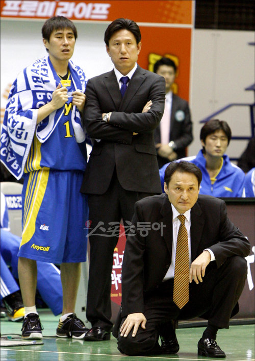 24일 원주치악체육관에서 열린 2009∼2010 KCC 프로농구 원주 동부 프로미 대 서울 삼성 썬더스의 경기에서 삼성 안준호 감독이 경기가 안 풀리는 듯한 표정을 짓고 있다. 교체를 기다리고 있는 이상민도 마찬가지. 이날 삼성은 동부에게 패하며 팀 최다 타이 8연패를 기록했다.