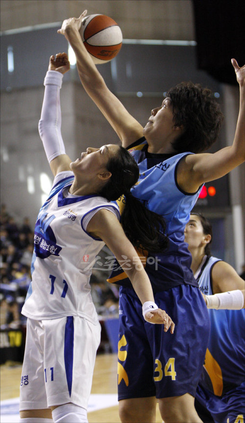 2일 용인실내체육관에서 열린 2009-2010 여자프로농구 챔피언결정전 2차전 신한은행 대 삼성생명의 경기에서 심한은행 하은주가 삼성생명 박정은의 공격을 블록슛 하고 있다.