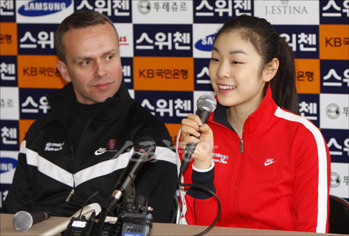 '피겨 퀸' 김연아(20·고려대)가 15일 서울 올림픽공원 체조경기장 특설 아이스링크에서 열린 ‘KCC 스위첸 페스타 온 아이스 2010(16일~18일)’ 리허설 후 가진 기자회견에서 취재진의 질문에 답하고 있다. 왼쪽은 안무가 데이비드 윌슨.