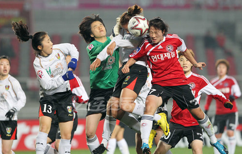 29일 고양종합운동장에서 열린 2010 WK리그 현대제철과 수원FMC의 경기. 현대제철 김주희가 문전헤딩슛을 시도하자 수원FMC 조소현과 골키퍼 임성미가 막아내고 있다.