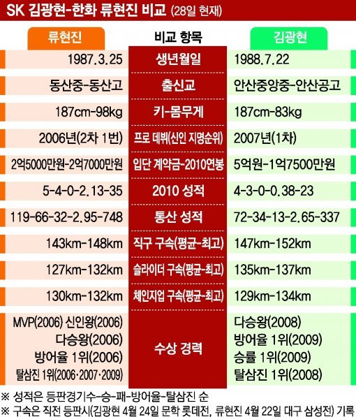 한화 류현진(23·왼쪽)과 SK 김광현(22). 두 ‘괴물’이 맞붙으면 과연 누가 이길까. 2000년대 한국프로야구를 대표하는 최고의 황금팔은 김광현일까, 류현진일까. 아쉽게도 둘은 아직 단 한 차례도 맞대결을 펼치지 않았다. 이런 까닭에 시간이 흐를수록 궁금증은 증폭되고 있다. 마치 시계바늘을 거꾸로 돌려 1980년대 롯데 최동원-해태 선동열의 ‘최고 오른팔 경쟁’을 옮겨놓은 듯한 난형난제의 대결이다. 시즌 초반부터 최고의 페이스로 타자들을 벌벌 떨게 만들고 있는 류현진과 김광현, 쉽사리 우열을 가리기 힘든 두 특급 좌완을 바라보는 각 팀 사령탑과 코치, 선수들의 시선을 모아봤다.