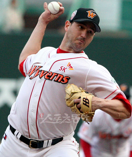 SK 김성근 감독은 13일 사직 롯데전에서 박현준을 깜짝 선발로 선택했다. 원래 선발 로테이션상 글로버(사진)를 낼 차례였지만 “어차피 1승인데 고민하다가 두산전에 내보내기로 했다”고 설명했다. 그러나 김 감독의 로테이션 변칙작전은 결국 실패로 끝나고 말았다. 14일 문학 두산전에서 글로버는 6이닝 12안타 3볼넷 5탈삼진 10실점(9자책)으로 완전히 무너졌다. 특히 1회 무사 2·3루서 김현수에게 좌월3점홈런, 5회 2사 1루서 최준석에게 좌월2점홈런, 6회 2사 후 이종욱에게 우월솔로홈런, 7회 무사서 임재철과 김현수에게 백투백 홈런까지 무려 5개의 홈런을 내주고 무릎을 꿇었다. 하지만 김 감독은 많은 실점에도 불구하고 7회까지 글로버를 내리지 않았다. 백투백 홈런을 맞고 투구수가 118개가 돼서야 임성현으로 교체를 했다. 선발진의 한 축을 구축해야 할 용병투수에 대한 질책성이 강했다.
