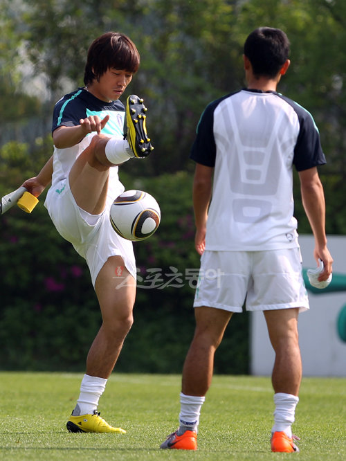 20일 오후 경기도 파주 축구트레이닝센터에서 열린 남아공 월드컵 축구대표팀 훈련에서 박주영이 선배 이영표가 보는 앞에서 볼을 가지고 장난을 묘기를 보이고 있다.