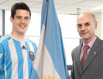 축구선수 출신으로 한국에 살고 있는 아르헨티나인 루시아노 올리에르 씨(왼쪽)가 16일 주한 아르헨티나 대사관에서 자국 국기를 가운데 두고 페데리코 모르치오 대리대사와 포즈를 취했다. 변영욱 기자