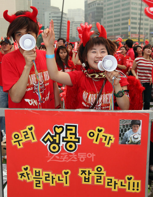 17일 오후 2010 남아공 월드컵 한국과 아르헨티나의 경기를 앞두고 서울시청광장에서 응원전이 펼쳐졌다. 한 커플이 골키퍼 정성룡 응원문구를 들고 응원하고 있다.