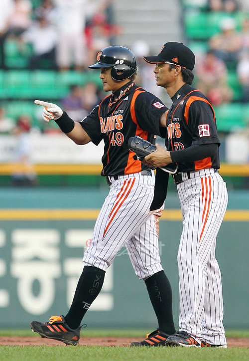 20일 오후 서울 잠실야구장에서 열린 프로야구 롯데자이언츠 대 LG트윈스의 경기 7회초 1사 주자 1루, 롯데 홍성흔이 우익수 앞 1타점 안타를 친 후 2루에서 환호하고 있다.
