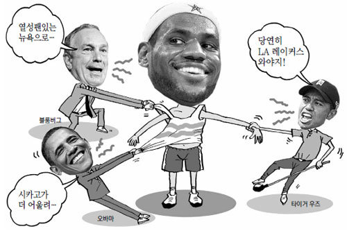 ‘골프 황제’ 타이거 우즈도 “나는 LA맨이다. 레이커스에 갔으면 좋겠다”고 말했다. 레이커스는 2년 연속 우승했지만 연봉상한선에 걸려 제임스 영입은 어려운 상태다. 지난 시즌 리그 꼴찌에 머문 뉴저지는 비욘세의 남편인 제이지(Jay-Z)가 제임스 영입에 적극적이다. 제이지는 뉴저지의 소액 구단주로 제임스와는 아주 가까운 사이다. 뉴욕은 마케팅으로 접근하고 있다. 제임스는 메디슨 스퀘어가든에서 항상 인상적인 플레이를 펼쳤다. 마이클 블룸버그 뉴욕시장도 제임스 영입에 가세했다.