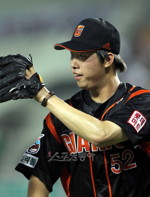 3일 저녁 서울 잠실야구장에서 열린 2010 프로야구 롯데 자이언트와 두산 베어스의 경기에서 8회말 두산 공격 선발 투수 이재곤이 두산의 손시헌과 정수빈이 병살아웃되자 밝게 웃으며 공수교대하고 있다.