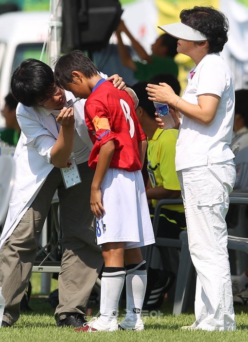 20일 경북 경주시 구황동 알천1구장에서 열린 ‘2010 경주 국제 유소년(U-12) 축구 페스티벌’ 한국 충무팀과 중국 절강 록성팀의 경기에서 한국 김창이 코피가 흘러 의료진에게 치료 받고 있다.