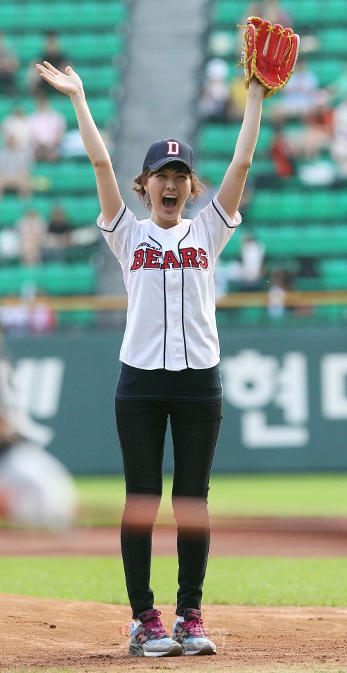 12일 서울 잠실야구장에서 열린 2010 프로야구 두산과 롯데의 경기. 경기에 앞서 박은지 MBC 기상캐스터가 시구를 한 뒤 기뻐하고 있다.