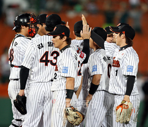 15일 저녁 부산 사직야구장에서 열린 2010프로야구 롯데와 SK의 경기에서 롯데가 6-5로 역전승을 거둔 후 선수들이 하이파이브를 하고 있다.