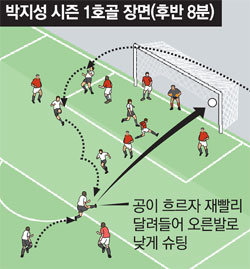 박지성은 올 시즌 정규리그인 프리미어리그 5경기 중 2경기(1경기 선발)만 뛰었다. 유럽축구연맹(UEFA) 챔피언스리그도 1경기만 나섰다. 출전 기회가 적었다. 이번 경기는 비록 2부 리그 하위권 팀과의 대결이었지만 개인적으로 골 부담을 털어내며 건재를 과시한 계기가 됐다.