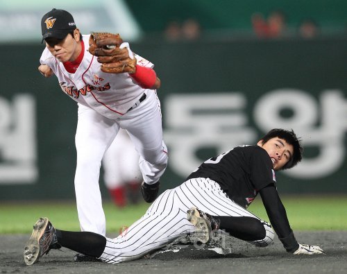 24일 인천 문학야구장에서 열린 2010 프로야구 SK와 LG의 경기에서 8회초 무사 1루 박경수 타석때 1루 주자 이대형이 도루를 시도하다 실패하고 있다. SK 2루수 모창민.