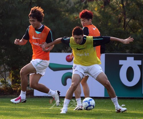 7일 오후 파주NFC에서 오는 12일 한일전을 앞두고 해외파 선수들의 훈련이 열렸다. 미니게임에서 이정수가 박주영과 박지성의 수비를 피해 공격하고 있다.