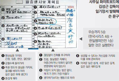 화이트보드에는 이 밖에 선수와 코치들뿐 아니라 스스로를 채찍질하기 위해 써 놓은 문구가 가득했다.